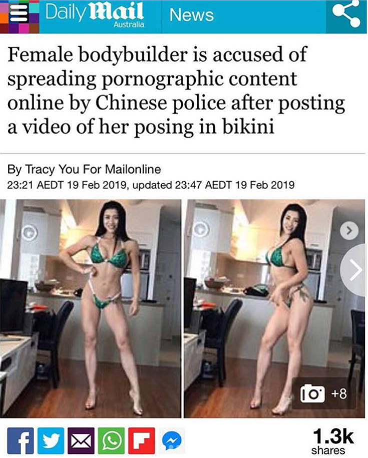 Μια Κινέζα μπόντι μπίλντερ κατηγορείται για πορνογραφία από την αστυνομία της χώρας της μετά την ανάρτηση βίντεο και φωτογραφιών στα μέσα κοινωνικής δικτύωσης που τη δείχνουν να παίρνει πόζες με μαγιό.