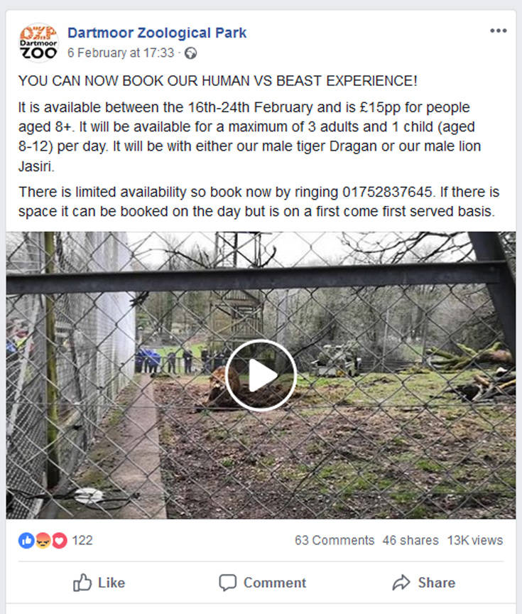 Η δραστηριότητα αναψυχής που προσφέρεται στο Dartmoor Zoological Gardens έχει μάλιστα και κανονισμούς, καθώς μιλά για «το πολύ 3 ενήλικες και 1 παιδί (ηλικίας 8-12)» που θα τεθούν απέναντι στο ζώο.