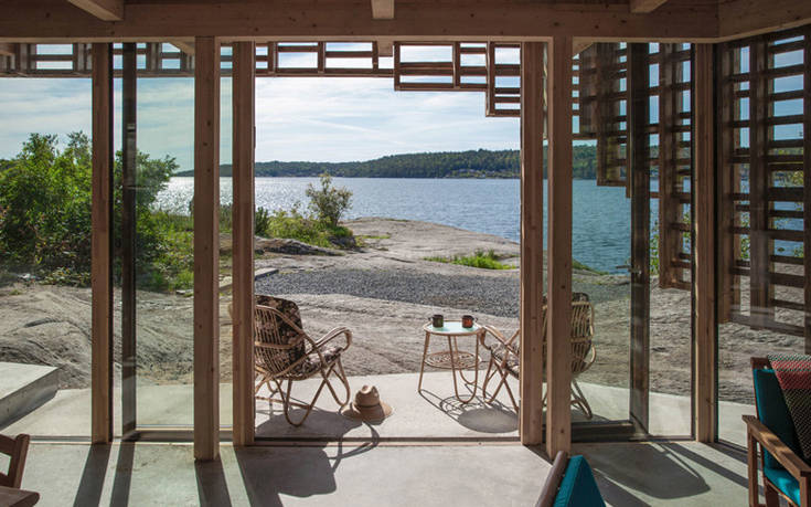 Όσο για το καφασωτό του μοτίβου, είναι σαν κέλυφος που περικλείει το εσωτερικό φυλακίζοντας εντός τη μεγαλοπρέπεια του παραλιακού τοπίου.