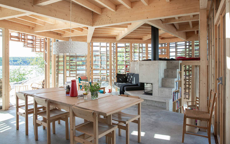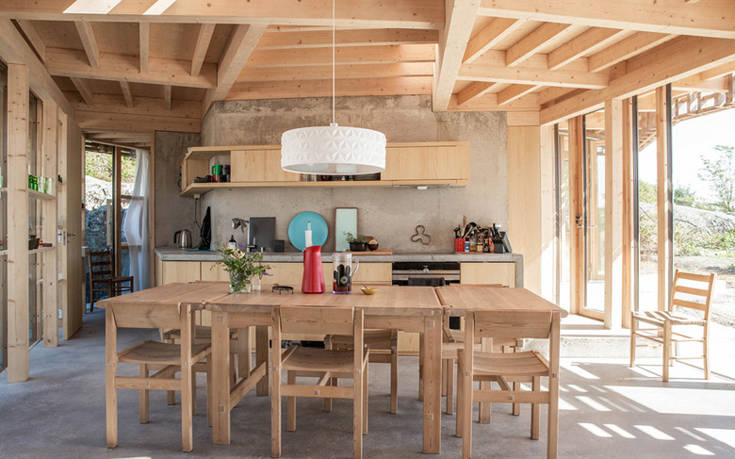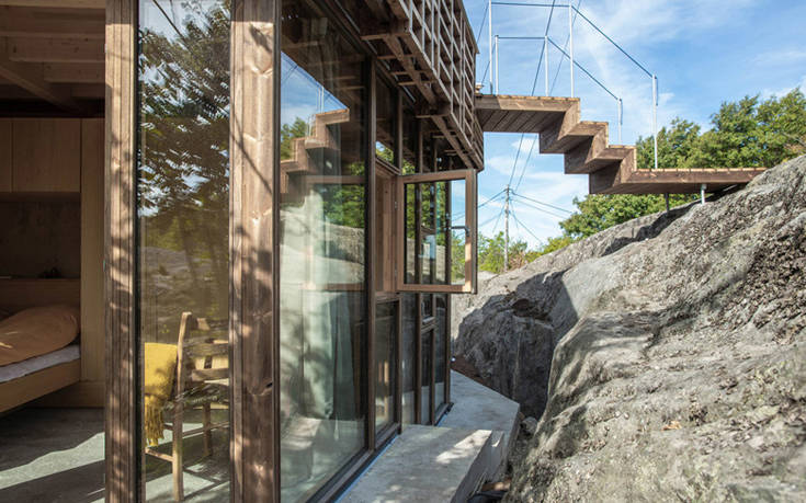 Το βραχώδες περιβάλλον συνεχίζει και μέσα στην οικία, χάρη στο τρικ που δημιουργεί το τσιμεντένιο πάτωμα, ενώ το ξύλινο πλαίσιο μοιάζει σαν να κάλυψε η φύση τα πάντα.