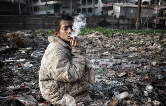 Η αθωότητα χάνεται: Ένα αγόρι από το Μπαγκλαντές πάνω σε σωρό από σκουπίδια καπνίζει