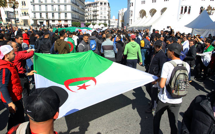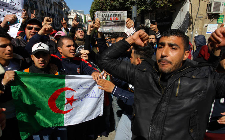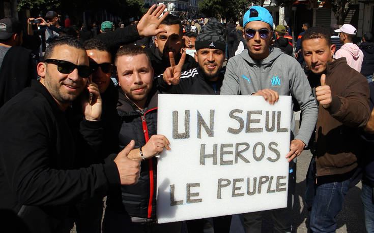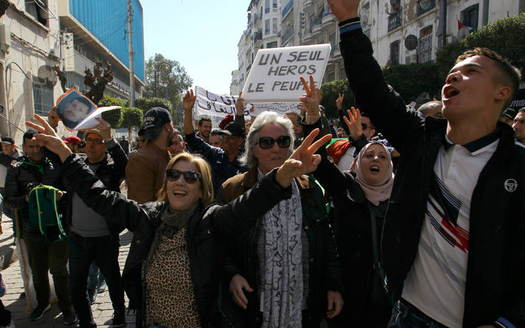 Φωνάζοντας συνθήματα όπως «Αντίο, Μπουτεφλίκα» και «Ειρηνικά, ειρηνικά», ορισμένοι κρατώντας τριαντάφυλλα, το πλήθος διαδήλωσε την αντίθεσή του στο σχέδιο του 81χρονου ηγέτη να παρατείνει την 20χρονη παραμονή του στην εξουσία στις εκλογές του Απριλίου.