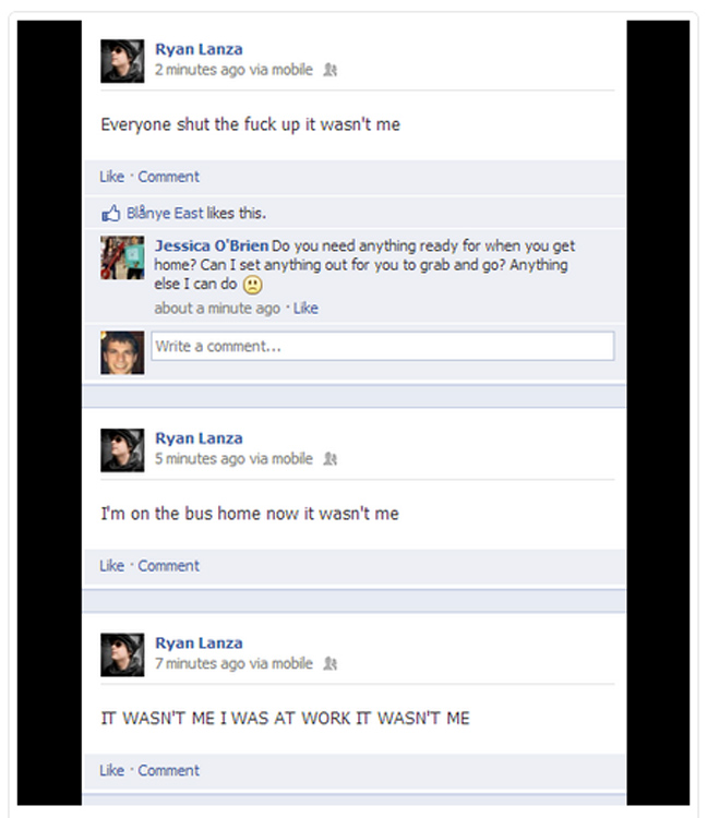 Όμως το μικρό όνομα του αληθινού δολοφόνου δεν ήταν Ryan αλλά Adam, με αποτέλεσμα ο 24χρονος να προσπαθεί να υπερασπιστεί τον εαυτό του λέγοντας στο προφίλ του «δεν ήμουν εγώ, εγώ ήμουν στη δουλειά και επιστρέφω σπίτι με το λεωφορείο».