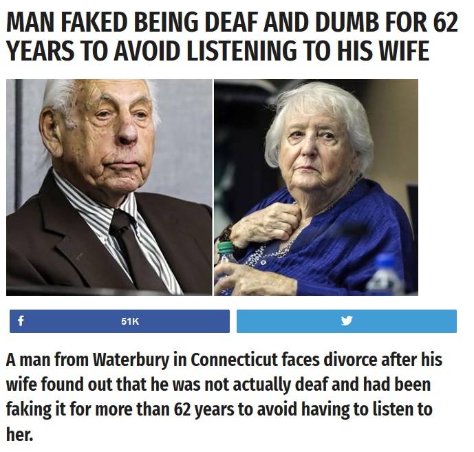 Η ιστορία που ακολουθεί φαίνεται πως βρίσκει πολλούς υποστηριχτές. Ένας άνδρας από Κονέκτικατ προσποιούνταν ότι είναι κουφός για 62 ολόκληρα χρόνια για να μην ακούει τη σύζυγό του. Το ζευγάρι τώρα, όπως αναφέρει η σελίδα worldnewsdailyreport. com, είναι στα δικαστήρια για διαζύγιο.