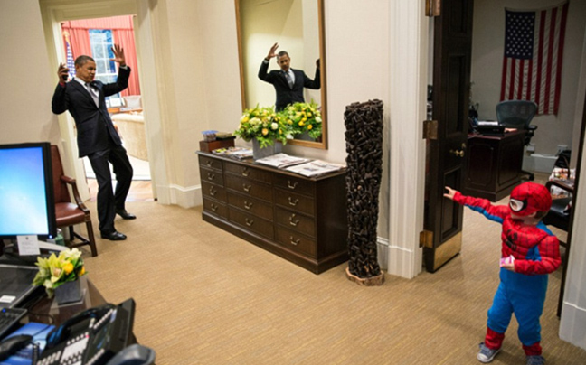 Έναν αμερικανό πρόεδρο όπως ίσως δεν τον έχουμε ξαναδεί ποτέ απεικονίζουν οι φωτογραφίες του Pete Souza. Μια από αυτές δείχνει τον Μπαράκ Ομπάμα να παριστάνει ότι πιάστηκε στην παγίδα ενός μίνι σπάιντερμαν που εισβάλλει στο γραφείο του, ο οποίος δεν είναι άλλος από το παιδί εργαζόμενου στον Λευκό Οίκο.