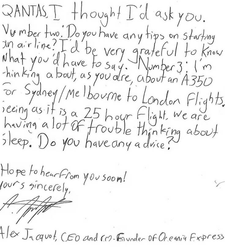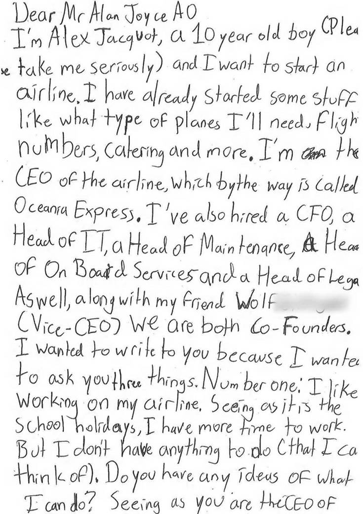 «Είμαι ο Alex Jacquot, 10 ετών (σας παρακαλώ να με πάρετε στα σοβαρά» γράφει ο πιτσιρικάς στη επιστολή του προς τον διευθύνοντα σύμβουλο της Qantas. «Θέλω να ξεκινήσω τη δική μου αεροπορική εταιρεία. Έχω ήδη προχωρήσει με κάποια πράγματα, όπως τι είδους αεροπλάνα θα χρειαστώ, catering, αριθμούς πτήσεων και τέτοια. Είμαι ο διευθύνων σύμβουλος της εταιρείας, η οποία ονομάζεται Oceania Express» γράφει και εξηγεί πως συνιδρυτής της εταιρείας είναι ο φίλος του Wolf και πως έχουν «προσλάβει» επικεφαλής Νομικού Τμήματος, Συντήρησης, IT κ. ά.