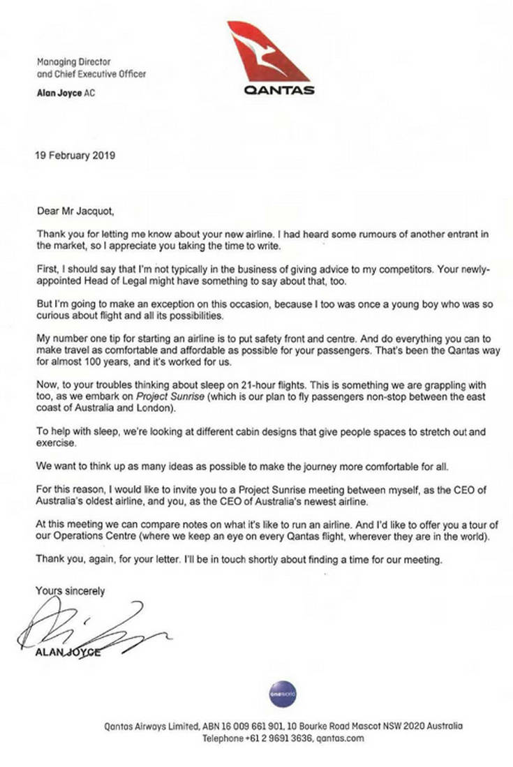 Τέλος, καλεί τον φιλόδοξο Alex σε ένα τετ-α-τετ «ανάμεσα στον CEO της παλιότερης και της νεότερης αεροπορικής εταιρείας της Αυστραλίας». «Στη συνάντηση αυτή μπορούμε να συγκρίνουμε τις σημειώσεις μας για τη διοίκηση αεροπορικών εταιρειών» του γράφει και τον προσκαλεί στο Κέντρο Λειτουργίας της Qantas, «εκεί όπου παρακολουθούμε κάθε πτήση της εταιρείας, όπου κι αν βρίσκεται σε όλο τον κόσμο».