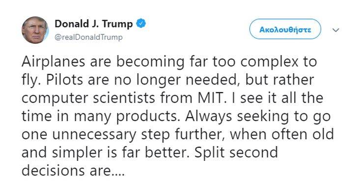 «Τα αεροπλάνα γίνονται υπερβολικά περίπλοκα για να κυβερνηθούν. Δεν υπάρχει πλέον ανάγκη για πιλότους, αλλά μάλλον για επιστήμονες πληροφορικής του ΜΙΤ (Τεχνολογικό Ινστιτούτο Μασαχουσέτης)», έγραψε στον λογαριασμό του ο Αμερικανός πρόεδρος.