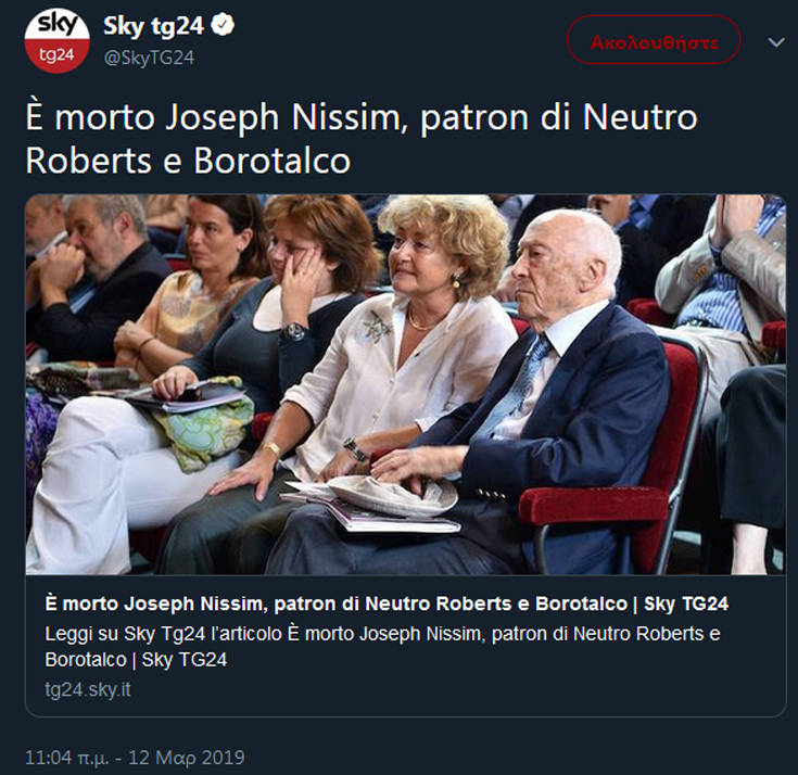 Σε ηλικία 100 ετών έφυγε από τη ζωή ένας από τους σημαντικότερους επιχειρηματίες της Ιταλίας, ο Τζόζεφ Τζο Νίσιμ, ο άνθρωπος που έκανε γνωστές σε όλη την Ευρώπη και τον κόσμο μάρκες προϊόντων όπως ο τόνος Rio Mare, το απορρυπαντικό Omino Bianco, τα Neutro Roberts, Vetril, ή Simenthal.