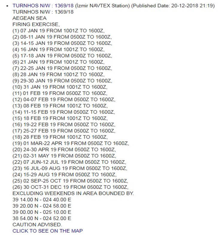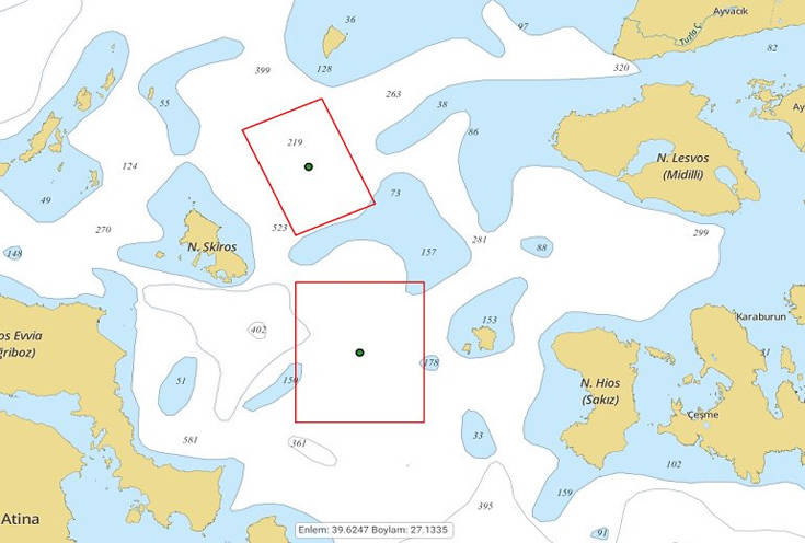Συγκεκριμένα, σύμφωνα με το news.gr, μέσω του σταθμού της Σμύρνης, που δεν έχει καμιά δικαιοδοσία να εκδίδει NAVTEX εντός ελληνικής υφαλοκρηπίδας και FIR Αθηνών, προχώρησε στην επανενεργοποίηση περσινής δέσμευσης περιοχών μεταξύ των νησιών της Σκύρου, της Εύβοιας και των Ψαρών, στη μία περίπτωση και μεταξύ Σκύρου και Άη Στράτη στη δεύτερη.