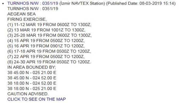 Με τη NAVTEX 351/19 οι Τούρκοι δεσμεύουν την πρώτη περιοχή για τις εξής ημερομηνίες: