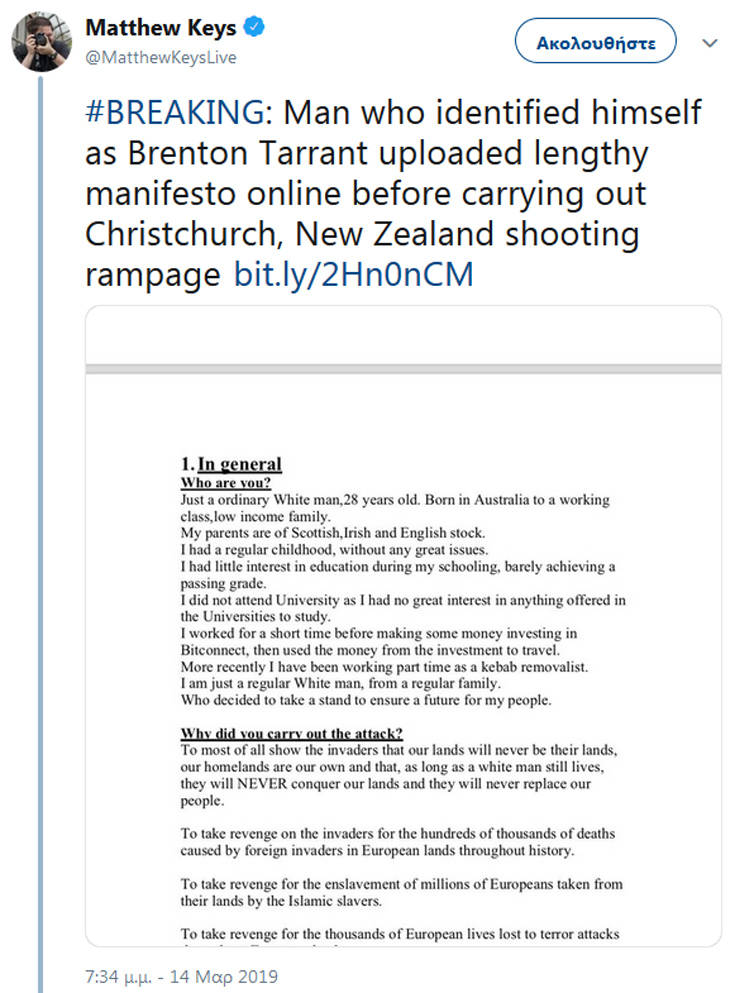 Ο τρομοκράτης που άνοιξε πυρ σε μουσουλμανικά τεμένη στη Νέα Ζηλανδία, δημοσίευσε στο διαδίκτυο ένα μανιφέστο, στο οποίο ανέφερε τα σχέδιά του για την επίθεση κάποιες ώρες πριν να την πραγματοποιήσει.