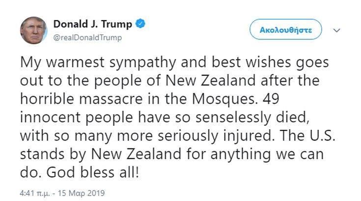 «Τη θερμότερη συμπάθειά μου και τις καλύτερες ευχές μου στον λαό της Νέας Ζηλανδίας μετά τη φρικτή σφαγή στα Τεμένη. Σαράντα εννέα αθώοι άνθρωποι πέθαναν άσκοπα και τόσοι πολλοί ακόμη τραυματίσθηκαν σοβαρά. Οι ΗΠΑ στέκονται στο πλευρό της Νέας Ζηλανδίας για ό,τι μπορούμε να κάνουμε. Ο Θεός να τους ευλογεί όλους», έγραψε ο Τραμπ στο Twitter.