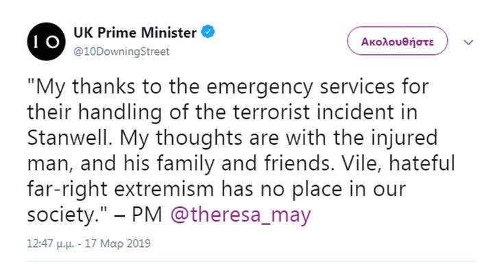 «Μολονότι η έρευνα αυτή είναι ακόμη στα πρώτα της βήματα, φέρει τα χαρακτηριστικά τρομοκρατικού συμβάντος, εμπνεόμενου από την ακροδεξιά και κατά συνέπεια έχει χαρακτηριστικά τρομοκρατικό επεισόδιο», εξήγησε σε ανακοίνωσή του ο Νιλ Μπάσου, ο επικεφαλής της αντιτρομοκρατικής υπηρεσίας της βρετανικής αστυνομίας, όπως αναφέρει το Αθηναϊκό Πρακτορείο Ειδήσεων.