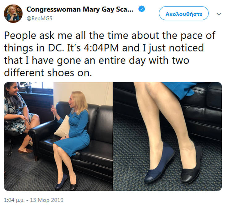 Ο λόγος για το μέλος του Κογκρέσου Μαίρη Γκάι Σκάνλον η οποία μοιράστηκε στο twitter τις επίμαχες φωτογραφίες από το στιλιστικό της ατόπημα μετά την παρατήρηση ότι φορούσε ένα μαύρο και ένα μπλε χρώμα όλη την ημέρα.