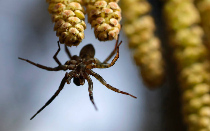 Μια αράχνη κρέμεται σε μία φουντουκιά σε δάσος, στα περίχωρα του Μινσκ της Λευκορωσίας.