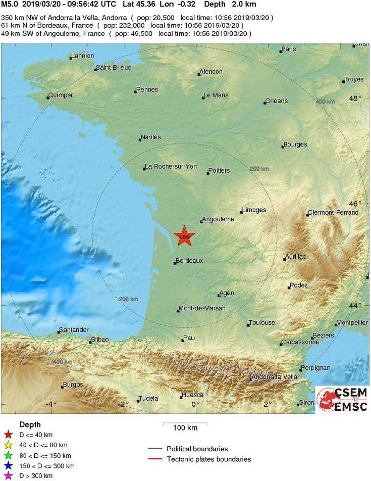 Η δόνηση που έχει επίκεντρο 59 χλμ. Βόρεια της πόλης Μπορντό έγινε ιδιαίτερα αισθητή λόγω του εστιακού βάθους, το οποίο εντοπίζεται στα 2 μόλις χλμ.