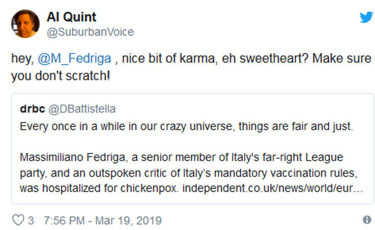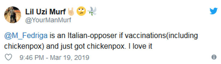 Δεν είναι λίγοι οι πολέμιοι των υποχρεωτικών εμβολιασμών ανά τον κόσμο, ακόμη και άτομα που εκπροσωπούν την πολιτική σκηνή των χωρών. Ένας από αυτούς είναι και ο Μασιμιλιάνο Φεντρίγκα, στην Ιταλία, ο οποίος νοσηλεύτηκε σε νοσοκομείο με συμπτώματα ανεμοβλογιάς, κάτι που πυροδότησε μια… καταιγίδα στη γειτονική χώρα -και όχι μόνο- διάθεση από τους πολίτες που έχουν αντίθετη άποψη. Ειδικά στα social media έγινε… πάρτι.