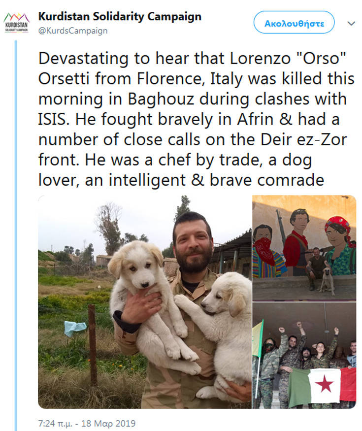 Νεκρός έπεσε σε ηλικία 33 ετών, στην πόλη Μπαγκούζ της Συρίας, τον τελευταίο θύλακα του ISISI που έχει απομείνει στη χώρα, ο Ιταλός αναρχικός ακτιβιστής Λορέντσο Ορσέτι, ο οποίος μαχόταν στο πλευρό των Κούρδων και Αράβων του SDF/YPG/YPJ ενάντια στο Ισλαμικό Κράτος.