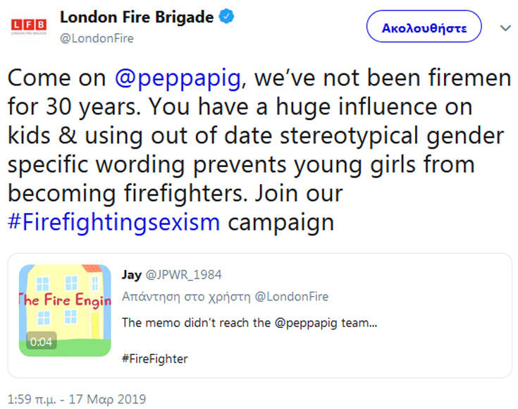Η Πυροσβεστική Υπηρεσία της βρετανικής πρωτεύουσας έγραψε σε ανάρτηση στο Twitter: «Έλα τώρα Πέππα, δεν είμαστε μόνο άνδρες πυροσβέστες εδώ και 30 χρόνια. Έχεις τεράστια επιρροή σε παιδιά και χρησιμοποιώντας παρωχημένα στερεότυπα με σεξιστικές διατυπώσεις, αποτρέπεις τα νέα κορίτσια από το να γίνουν πυροσβέστες».