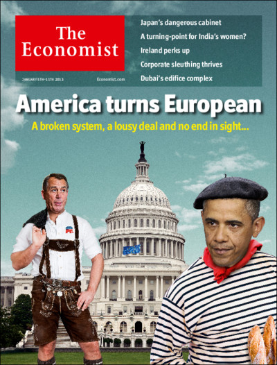 Με τίτλο «Η Αμερική γίνεται Ευρώπη» το περιοδικό Economist επικρίνει λοιπόν τον Ομπάμα, καθώς όπως και οι Γάλλοι -τους οποίους οι Βρετανοί δε συμπαθούν και πολύ- αποφάσισε να φορολογήσει τους πλούσιους για να γλυτώσει τη μεσαία τάξη και ταυτόχρονα ασκεί κοινωνική πολιτική εις βάρος των υψηλών εισοδημάτων και πλουσίων.