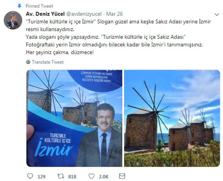 Την γκάφα του «εκλεκτού» του Ερντογάν αποκάλυψε ο αντίπαλός του στις εκλογές από το αντιπολιτευόμενο κόμμα CHP, Ντενίζ Γιουτσέλ, που σε ανάρτησή του στο Twitter σχολίασε: «Ωραίο το σλόγκαν “Σμύρνη, συνυφασμένη με τον τουρισμό και τον πολιτισμό”, αλλά μακάρι αντί για τη φωτογραφία της Χίου να χρησιμοποιούσατε της Σμύρνης. Ή το σλόγκαν “Το νησί της Χίου, συνυφασμένο με τον τουρισμό και τον πολιτισμό”. Δεν έχετε καν γνωρίσει τη Σμύρνη αν δεν ξέρετε ότι το μέρος της φωτογραφίας δεν είναι η Σμύρνη. Όλα είναι ψεύτικα!».