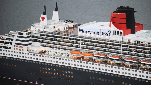 Όχι όποιο κρουαζιερόπλοιο να ‘ναι, αλλά το θηριώδες Queen Mary 2 επιστρατεύτηκε για να δηλώσει δημόσια ο Stefan Libon την πρόθεσή του να παντρευτεί την καλή του. Όταν το πλοίο μπήκε στο λιμάνι του Σίδνεϊ την ημέρα του Βαλεντίνου, καλούσε την Jess να… το παντρευτεί.