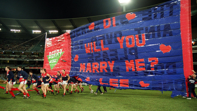 Ο οπαδός ο συνεπής χρειάζεται την αγαπημένη του ομάδα στο πλευρό του στην ιδιαίτερα τρυφερή αυτή στιγμή του! Ολάκερη η ομάδα ράγκμπι της Μελβούρνης πέρασε λοιπόν κάτω από το θεόρατο μπάνερ το 1999, για να δουν όλοι (και η Di ελπίζουμε) το μήνυμα της αγάπης…
