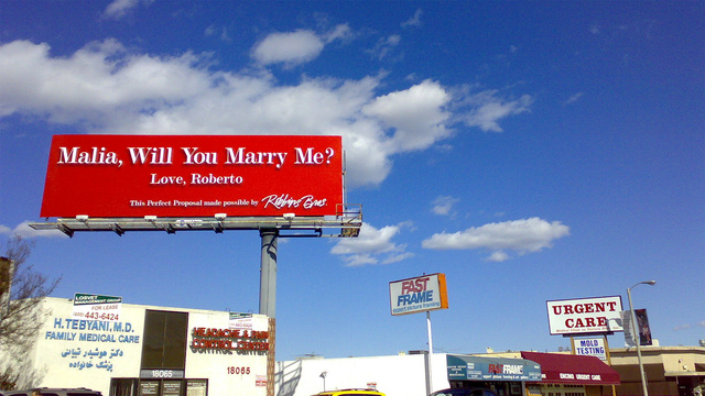 Οι διαφημιστικές γιγαντοαφίσες απαγορεύονται πλέον στη χώρα μας, γι’ αυτό και δεν βλέπουμε στην Ελλάδα τέτοιες εκδηλώσεις αγάπης(!). Στα σίγουρα όμως η Malia θα θαμπώθηκε από το γεγονός και θα είπε το πολυπόθητο «ναι»…