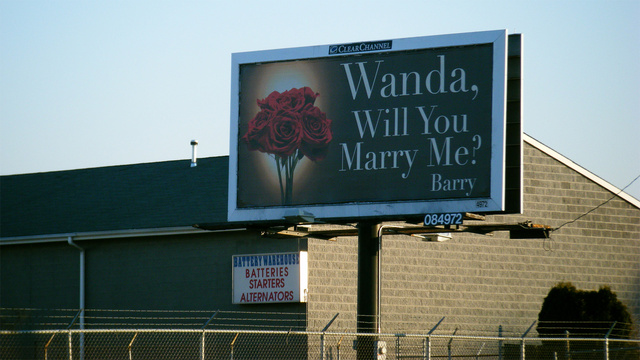Γιατί να περιορίζεσαι σε απλά γράμματα όταν μπορείς να φιλοτεχνήσεις την τεραστίων διαστάσεων δημόσια πρόταση γάμου σου; Οι επόμενης γενιάς γιγαντοαφίσες περιλαμβάνουν και εικαστικά (λουλούδια, στη συγκεκριμένη), για να γίνουν ακόμα πιο ελκυστικές, ακόμα πιο… πειστικές!