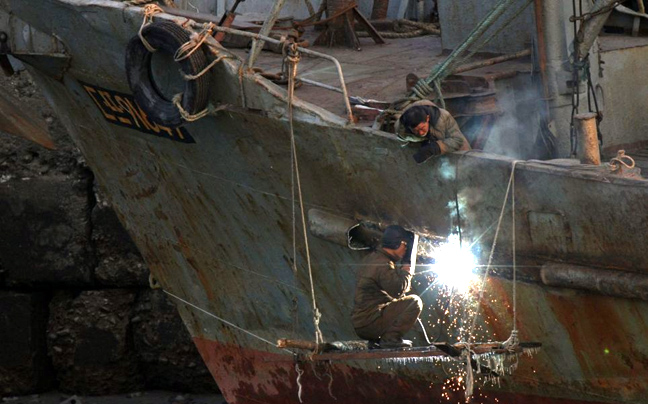 Από τη μία απεικονίζονται τα πυροτεχνήματα και οι εκδηλώσεις εορτασμού του νέου έτους στην Πιονγκγιάνγκ και από την άλλη η σκληρή δουλειά στα ναυπηγεία της χώρας.