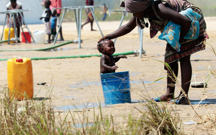 Μια μητέρα κάνει μπάνιο το μωρό της σε έναν κουβά σε έναν καταυλισμό για τους επιζώντες του κυκλώνα «Idai» στη Beira, με τη χολέρα να θερίζει τη Μοζαμβίκη.