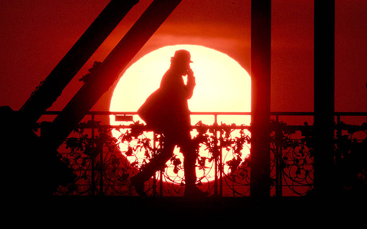 Ο ήλιος ανατέλλει πίσω από πεζογέφυρα της «Eiserne Steg» στη Φρανκφούρτη της Γερμανίας.