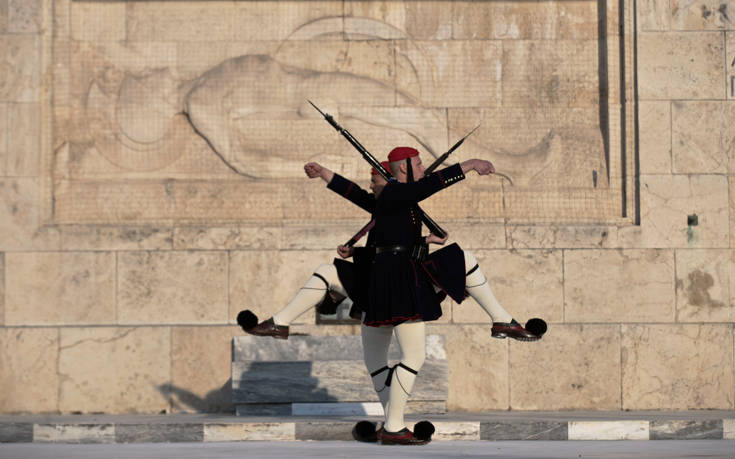 Οι Εύζωνες, κατά τη διαδικασία αλλαγής φρουράς, μπροστά από το μνημείο του άγνωστου στρατιώτη, στο κέντρο της Αθήνας.