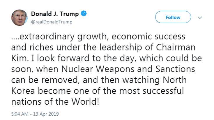 «Ανυπομονώ για τη μέρα αυτή, που θα μπορούσε να είναι σύντομα, όταν θα μπορέσουν να αρθούν τα Πυρηνικά Όπλα και οι Κυρώσεις, και κατόπιν να δούμε τη Βόρεια Κορέα να αναδειχθεί σε ένα από τα πιο επιτυχημένα κράτη του Κόσμου!» υπογράμμισε ο δισεκατομμυριούχος στο μήνυμά του.