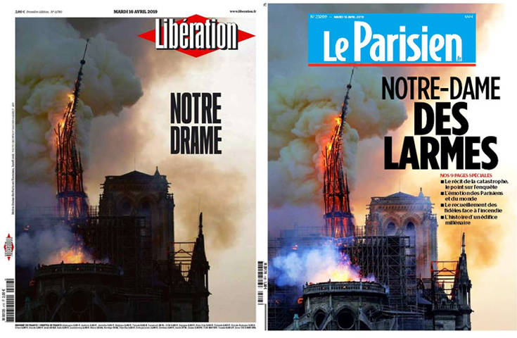 Η Libération κάνει λογοπαίγνιο με το Notre Dame και έχει τίτλο «Notre Drame», δηλαδή «Το δράμα μας» και η Le Parisien γράφει «Η Παναγία των Δακρύων»