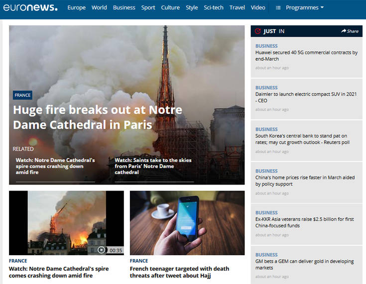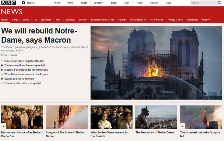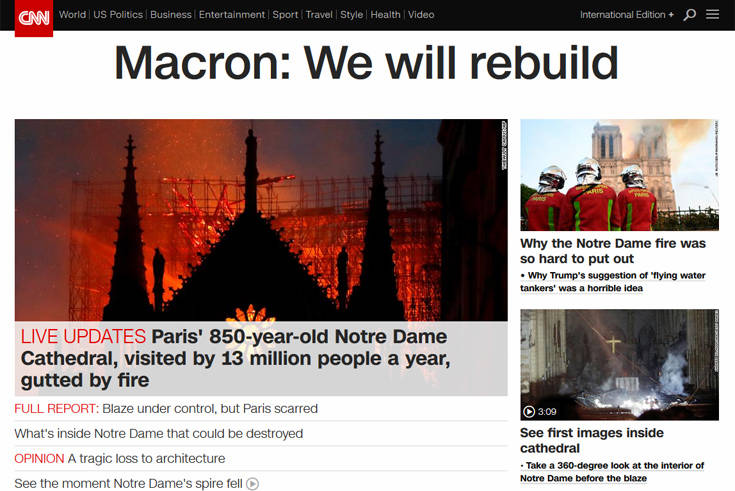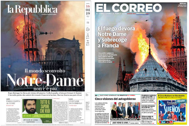 Η ιταλική La Repubblica γράφει για την τραγωδία στην εκκλησία με τη μεγαλύτερη επισκεψιμότητα στον πλανήτη και η ισπανική El Correo έχει τίτλο «Η φωτιά καταβροχθίζει την Παναγία των Παρισίων»