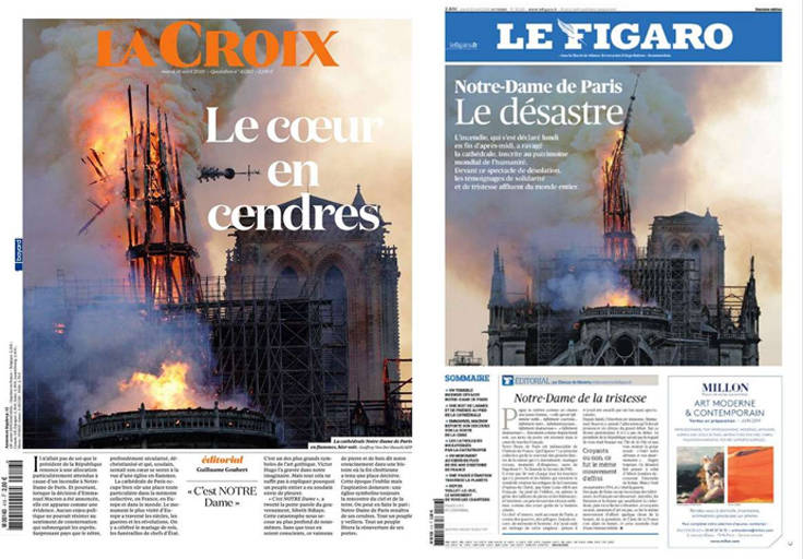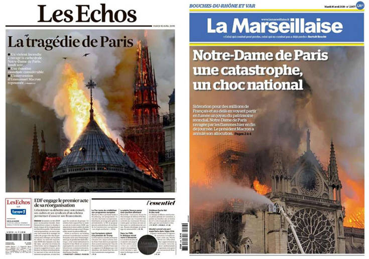 «Η τραγωδία του Παρισιού» είναι ο τίτλος της Les Echos ενώ η La Marseillaise αναφέρει «Παναγία των Παρισίων, καταστροφή, εθνικό σοκ»