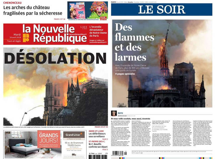 «Οδύνη» γράφει στο πρωτοσέλιδό της η La Nouvelle Republique και η βελγική Le Soir έχει τίτλο «Φλόγες και δάκρυα»