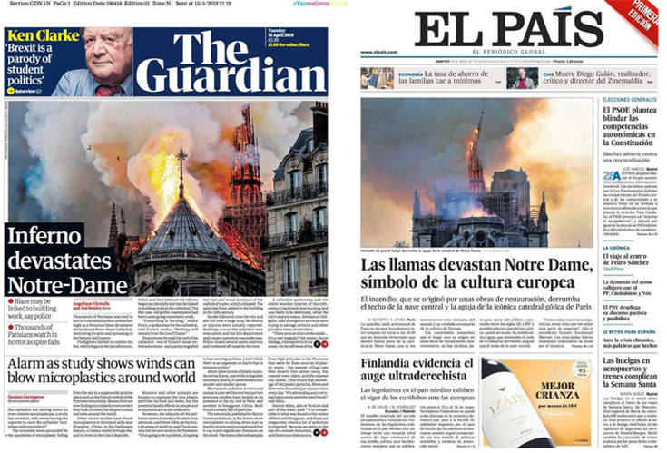 «Φωτιά καταστρέφει την Παναγία των Παρισίων» είναι το πρωτοσέλιδο του Guardian, όπως και η ισπανική El Pais που σημειώνει πως πρόκειται για ένα σύμβολο της ευρωπαϊκής κουλτούρας