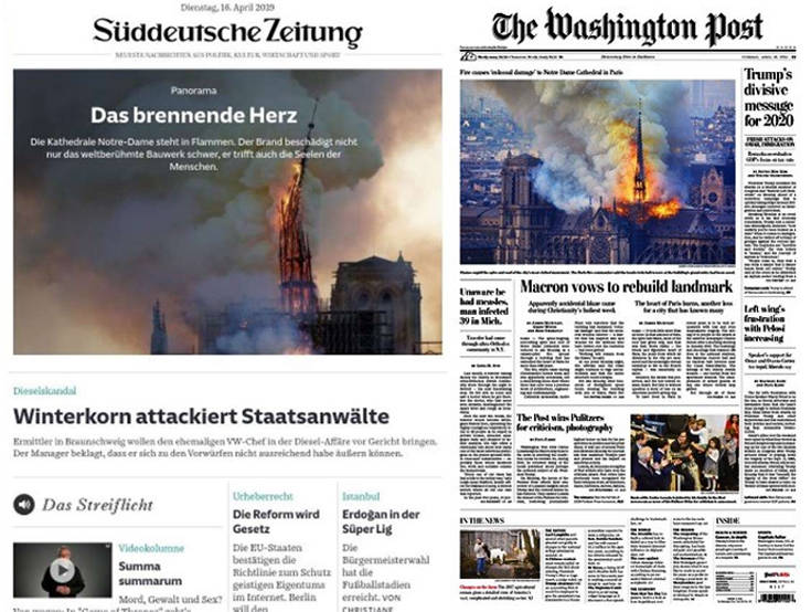 Η Suddeutsche Zeitung έχει στο πρωτοσέλιδό της τη συγκλονιστική στιγμή που καταρρέει το φλεγόμενο βέλος του γοτθικού ναού ενώ η Washinton Post έχει πρώτο θέμα τη φωτιά με φωτογραφία και το μήνυμα του Μακρόν για την ανοικοδόμηση του εμβληματικού μνημείου