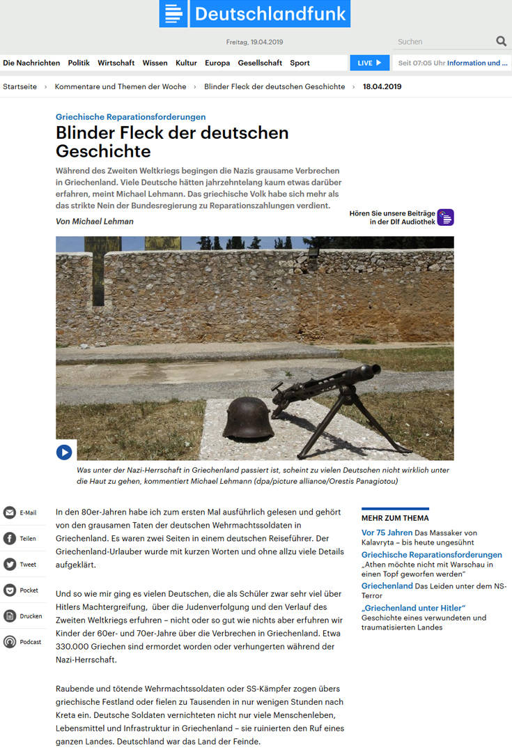 Για τα «φρικτά εγκλήματα» που διέπραξαν στην Ελλάδα οι Ναζί κατά τη διάρκεια του Δευτέρου Παγκοσμίου Πολέμου, όπως γράφει ο Μίχαελ Λέμαν, ανταποκριτής του πρώτου δημόσιου ραδιοτηλεοπτικού δικτύου ARD στην Αθήνα, στην ιστοσελίδα του δημόσιου γερμανικού ραδιοφώνου Deutschlandfunk (DLF), σημειώνοντας πως πολλοί Γερμανοί δεν ήξεραν γι’ αυτά επί δεκαετίες. Ο ελληνικός λαός δικαιούται περισσότερα από ένα απόλυτο «όχι» της γερμανικής κυβέρνησης για τις πολεμικές αποζημιώσεις, προσθέτει.