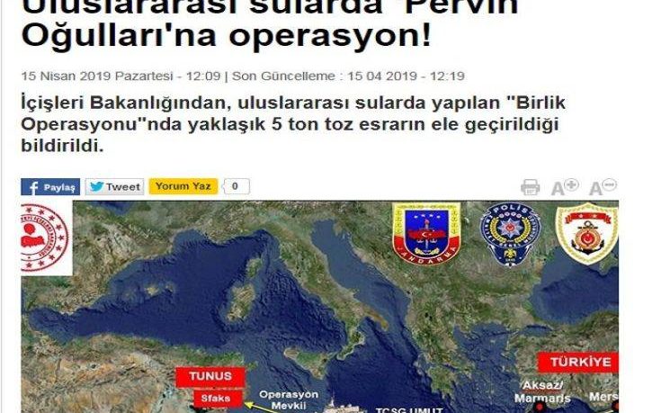 Το αλιευτικό με τουρκική σημαία M/V Pervin Oğulları μετέφερε 5 τόνους μαριχουάνας.