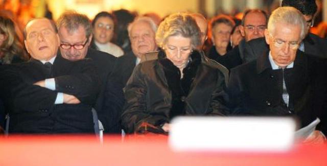 Ο πρώην πρωθυπουργός της Ιταλίας Σίλβιο Μπερλουσκόνι «συνελήφθη» από την κάμερα να κοιμάται την ώρα εκδήλωσης στον κεντρικό σιδηροδρομικό σταθμό του Μιλάνου, έχοντας δίπλα του τον σημερινό πρωθυπουργό Μάριο Μόντι και τη σύζυγό του Έλσα Αντονιόλι. Η εκδήλωση αφορούσε τα αποκαλυπτήρια ενός μνημείου αφιερωμένου στους Εβραίους που έπεσαν θύματα του ναζισμού και του φασισμού στο Μιλάνο.