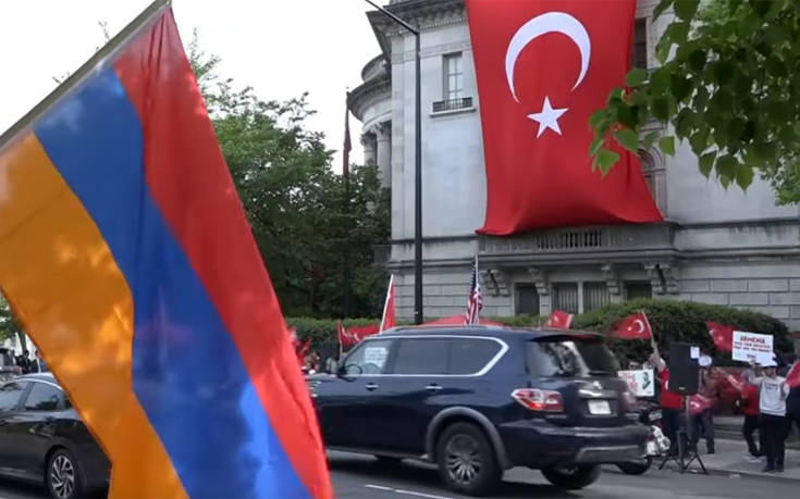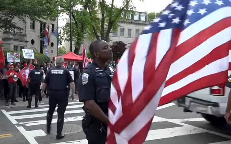 Οι διαδηλωτές, όμως, βρέθηκαν αντιμέτωποι με αντισυγκέντρωση τουρκικών οργανώσεων που ήταν παρατεταγμένες περιμετρικά της κατοικίας του Τούρκου πρέσβη στην Ουάσινγκτον. Οι αρμενο-αμερικανικές οργανώσεις βρίσκονταν στον ακριβώς απέναντι κυκλικό κόμβο. Πρόκειται για το ίδιο σημείο στο οποίο πριν από δύο χρόνια οι άνδρες της ασφάλειας του Πρόεδρου Ερντογάν είχαν επιτεθεί εναντίον Κούρδων διαδηλωτών. Λόγω του συγκεκριμένου περιστατικού, η αστυνομία της Ουάσινγκτον είχε λάβει ισχυρά μέτρα ασφαλείας.