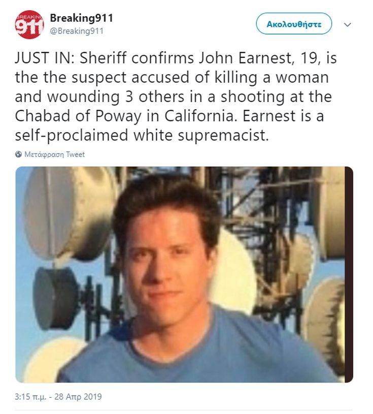 Ο φερόμενος δράστης της επίθεσης του Σαββάτου στη συναγωγή στο Σαν Ντιέγκο είναι ο 19χρονος Τζον Έρνεστ, σύμφωνα με τις αστυνομικές αρχές και φέρεται να είναι και ο συντάκτης ενός «μανιφέστου» στο οποίο ο ίδιος διατείνεται ότι επιχείρησε να βάλει φωτιά σε ένα γειτονικό τέμενος πριν από ένα μήνα, δηλώνοντας ότι άντλησε έμπνευση από τον λευκό εθνικιστή, δράστη της σφαγής σε δύο τεμένη στην Νέα Ζηλανδία.