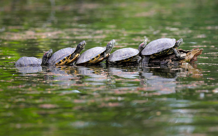 Χελώνες… χαλαρώνουν πάνω σε ένα κλαδί δέντρου σε πάρκο στο Βουκουρέστι, στη Ρουμανία,