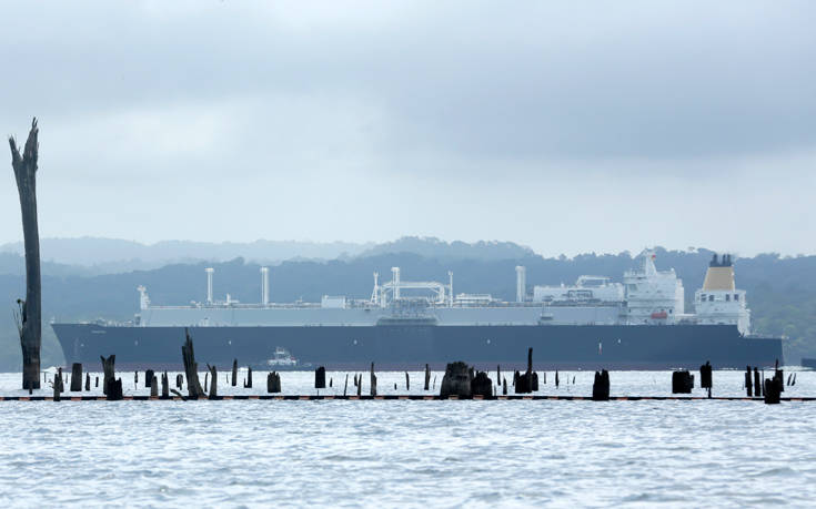 Ένα φορτηγό πλοίο διασχίζει το κανάλι του Παναμά στο δρόμο προς τον Ατλαντικό Ωκεανό, ενώ κορμοί δένδρων εμφανίζονται στην επιφάνεια της θάλασσας, λόγω των χαμηλών επιπέδων υδάτων της λίμνης Γκατούν.