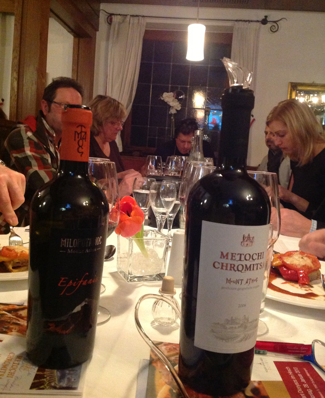 ενώ προβλήθηκαν και δοκιμάσθηκαν αγιορείτικοι οίνοι από το Μετόχι Χρωμίτσας της Ιεράς Μονής Αγίου Παντελεήμονος και από το Μυλοπόταμο της Ιεράς Μονής Μεγίστης Λαύρας.