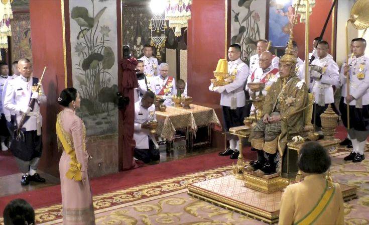 Σήμερα στο Μεγάλο Παλάτι της Μπανγκόκ, λίγα λεπτά αφού ο σύζυγός της φόρεσε στο κεφάλι του τη «Μεγάλη Κορώνα της Νίκης», τον προσκύνησε σε ένδειξη σεβασμού. Ο βασιλιάς έριξε λίγες σταγόνες νερό στο μέτωπό της προτού της δώσει τα σύμβολα του νέου της ρόλου, αυτού της βασίλισσας. Στη συνέχεια έκατσε δίπλα του στην αίθουσα του θρόνου.